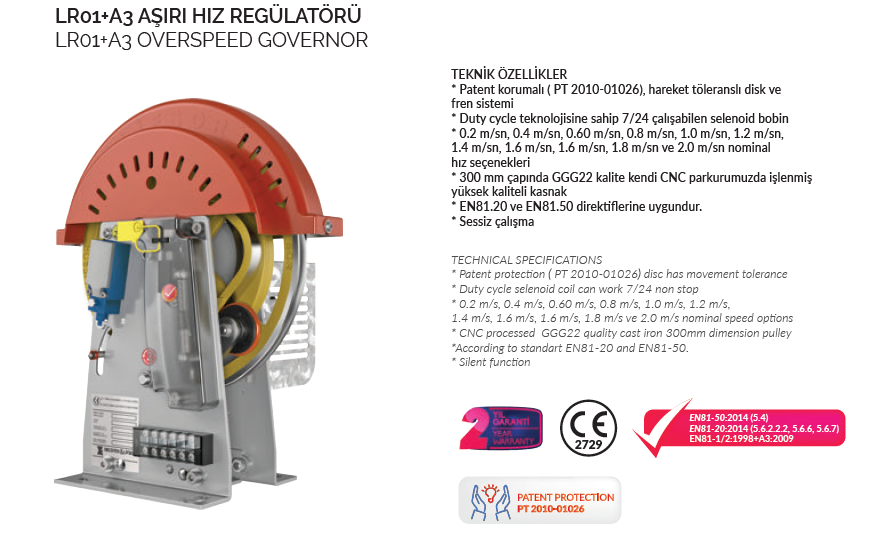 Die LR-01 Geschwindigkeitsbegrenzer ist eine sicherheitskritische Komponente zum Schutz von Passagieren und Aufzugsanlagen in Notfallsituationen. Nach strengsten europäischen Sicherheitsnormen gefertigt, gewährleistet diese Komponente durch hochwertige Materialien und Präzisionstechnik zuverlässigen Schutz über die gesamte Lebensdauer der Aufzugsanlage. Technische Werte: % 15 indirim: 8.459,51 TL 7.190,58 TLKDV Dahil.