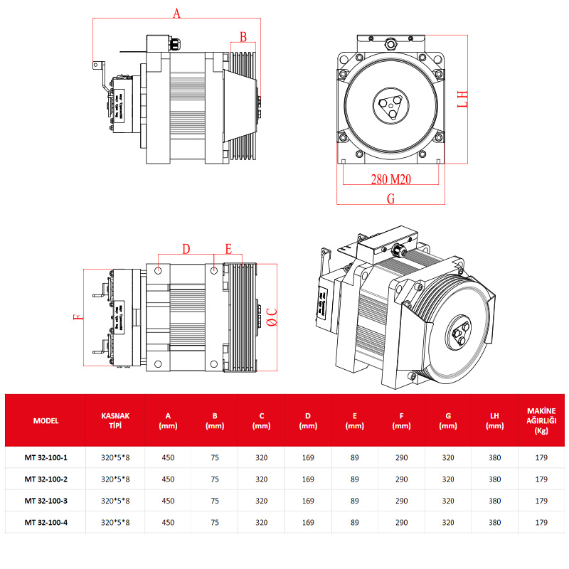 Metroplast asansör dişlisiz motorları kompakt tasarım sayesinde makine daireli ve dairesiz projelerde uygulama avantajı sağlar. Metroplast dişlisiz makinaları enerji verimliliği, sessizlik ve maksimum konforla çalışır. Asansör direktifi 2014/33 EU ve EN81-20, EN81-50 uygundur. Metroplast dişlisiz makinalarımızda Almanya üretimi MAYR marka elektro manyetik frenler kullanılarak maksimum asansör güvenliği seviyesi sağlanmıştır. Kat seviye belirlemesi ve konforlu seyir için müşteri talebine göre Fenac (Sin-Cos) veya Heidenhain (EnDat) enkoder kullanılabilir. Monoblok gövdede bulunan elektrik bağlantı kutusu ile montaj ve erişim kolaylığı sağlar. Ürünlerimiz kaliteli ve sağlam sandık ambalajlarla sevk edilir. #top #wrap_all .avia-button.av-lj2lray2-a07d14dcb92385ce858f207439f2f9a4{ margin-bottom:5px; margin-right:5px; } Mayr Uygunluk Belgesi MODEL HIZ (m/s) GÜÇ (KW) KAPASİTE (Kg) KASNAK ÖLÇÜLERİ (mm) DEVİR (RPM) AKIM (A) TORK (Nm) FREN TORKU (Nm) KUTUP FREKANS (Hz) SEYİR MESAFESİ (m) MAKİNE AĞIRLIĞI (Kg) MT 32-100-1 1,00 4,3 630 Ø320x5x8mm 120 11,5 345 2*360 20 Pole 20 Hz 45 179 MT 32-100-2 1,00 5,5 800 Ø320x5x8mm 120 15 440 2*360 20 Pole 20 Hz 21 179 MT 32-100-3 1,60 6,9 630 Ø320x5x8mm 191 16,5 345 2*360 20 Pole 32 Hz 45 179 MT 32-100-4 1,60 8,8 800 Ø320x5x8mm 191 21,5 440 2*360 20 Pole 32 Hz 21 179