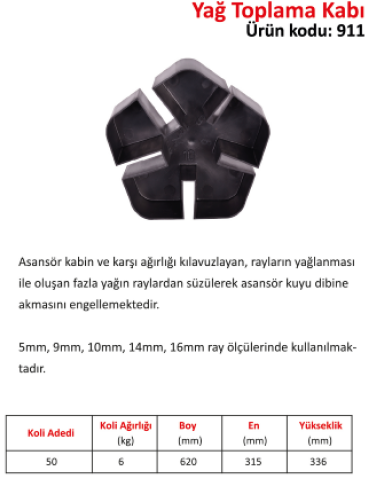 standart asansör yağ toplama kabı, kılavuz rayları yağlayan yağdanlıklardan ve ray yüzeyinden sızan fazla yağın kuyu dibine damlamadan toplanmasını sağlayan bir bakım aksesuarıdır.