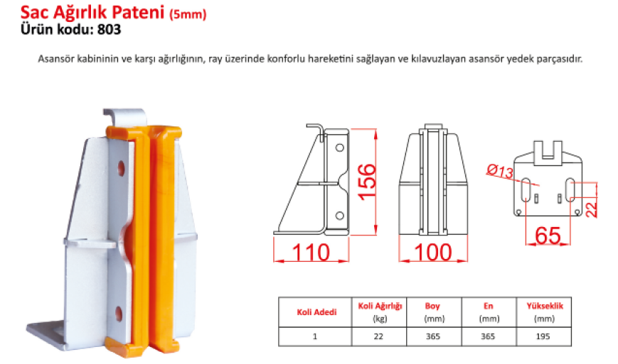 Saç asansör ağırlık pateni, karşı ağırlık çerçevesinin kılavuz ray üzerinde düşey kılavuzlanmasını sağlayan saç gövdeli birimdir. Karşı ağırlık, kabinle dengeli hareket etmesi gereken bir düşey kütle olduğundan, ray üzerinde simetrik ve sessiz kılavuzlanması kabin konforu ile halat sürtünme ömrü açısından kritik önem taşır. Saç gövde, karşı ağırlık çerçevesinin dört köşesine cıvatalı olarak sabitlenir ve içine yerleştirilen paten plastiği rayın yanak ile taban yüzeylerine sürekli temas halinde kalır. Yüzey işlemli sac, korozyona karşı ek koruma sunarken kalıcı greslenmiş temas noktaları sayesinde bakım aralıkları uzun tutulabilir. Karşı ağırlık hareketinde meydana gelen hafif yanal sapmalar, plastik yatağın elastik yapısında soğurulur; böylece halat üzerinde salınım azalır ve tahrik kasnağında düzgün sarım sağlanır. Ürün, asansorfabrikasi.com üzerinden ray kalınlığı ve karşı ağırlık çerçeve ölçüleri doğrulandıktan sonra uyumlu plastik yatak ile birlikte veya gövde olarak ayrı sevk edilebilir.
